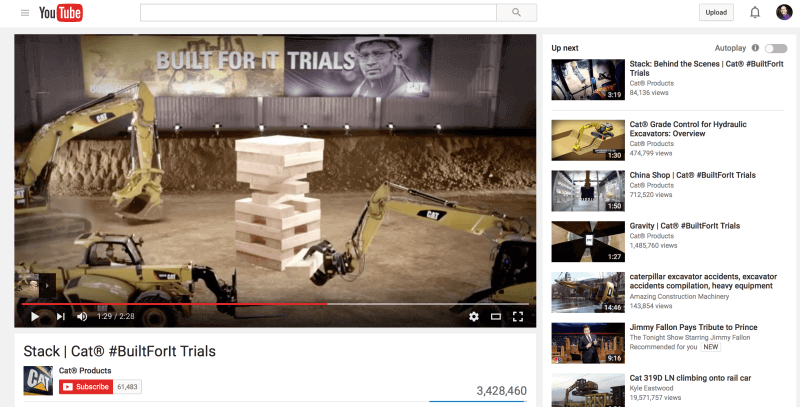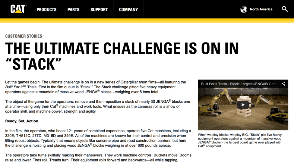 Caterpillar hit it out of the park with their giant Jenga campaign, which featured a video of two CAT machines playing the world’s largest game of Jenga with massive wooden blocks weighing eight tons in total. The video was hosted on YouTube (with almost 3.5 million views!), and CAT cleverly created a page on their site featuring the video to attract links.