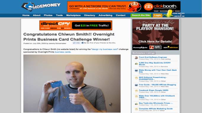 Case in point: Power user Jeremy Schoemaker, aka Shoemoney. I asked, and he agreed, to run a contest in conjunction with my client, OvernightPrints.com. My campaign idea was that an entrant could “Win Free Business Cards for Life” by designing Jeremy’s new business card.