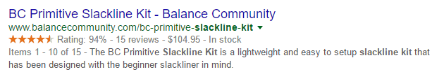 Snippets are like putting a bow tie on a cute cat. Cute cats on their own are great, as are first-page listings. But put a bow tie on that kitty and you’ve got something that few can resist. Rich snippets are among my favorite SEO tactics. Coupled with a great, enticing meta description and title tag, they make your snippet stand out from the crowd. In this case, if you’re looking for the best slackline to give to your outdoorsy significant other, you are going to want to look for the listing that looks like it is an awesome product from a quality supplier.