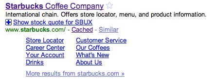 This is the description from the listing for Starbucks in the Open Directory. Despite the fact that the meta description (“Starbucks.com home page”) includes the search term (in this case “starbucks”) and the ODP description doesn’t, the latter is what is chosen for the snippet. If you don’t want your ODP listing to be the basis for your title or snippet, use the meta robots NOODP tag, as explained here.