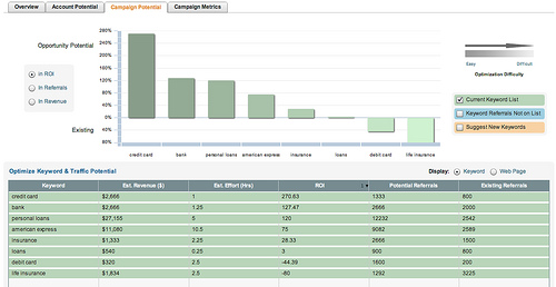 With this application, the first step is to create “opportunities” to help you determine whether a given SEO campaign is worth going after. You can estimate the number of potential referrals available, the revenue impact of those referrals, the amount of work required, and the resulting ROI. All these variables may be customized to the unique situation of a given vendor or client.