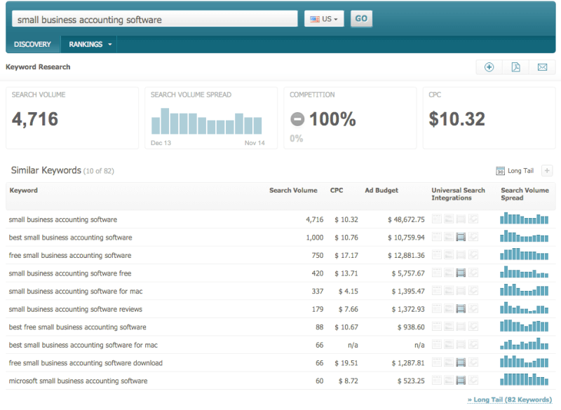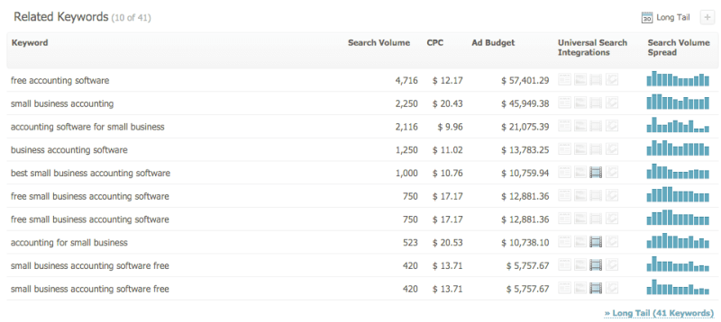 This can be especially effective for optimizing your landing pages. Let’s say your landing page is selling small business accounting software. You simply plug in the keyword at the top of the Searchmetrics interface, and the database searches its 600 million keyword inventory to come up with relevant, related keywords and concepts that you can add to the page to provide better, more user-friendly content.