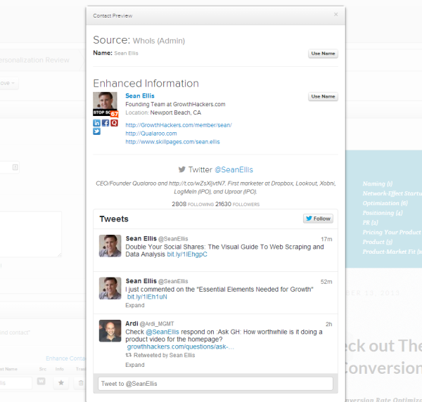 Now that I’ve identified the relevant websites based on various criteria, I retrieve contact details from the websites, domain records and other sources. I’m not just talking about names and emails. I’m talking about Twitter, Google+, LinkedIn, Facebook, YouTube, Tumblr and other contacts’ social media profiles.