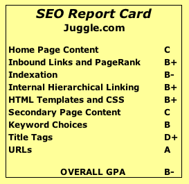 A “site:juggle.com” query shows 47,000 pages indexed in Google. That’s not a bad number, but I would have expected better for such a large content-rich site as Juggle.com. The PageRank really falls off quickly, too, as you go deeper down the site tree. The home page registers a PR5 with the PageRank meter in the Google Toolbar, but go two clicks deeper and the meter registers PR0. That’s not good. If it were a brand new site, this would be understandable because it takes several months for PageRank scores to get exported to the Toolbar Server. With a steep drop off in PageRank like this, it’s not surprising the indexation suffered. Poor PageRank = poor crawl equity = poor indexation.