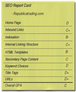 The product pages were indexed in Google despite the spider-unfriendly URL structure generated by their Miva Merchant platform (e.g. http://www.republicatrading.com/mm5/merchant.mvc?Screen=PROD&StoreCode=R&ProductCode=Bogota&CategoryCode=). This was probably due to the tiny number of SKUs (eight). This became 25 unique URLs in Google’s index (according the Google search results because of duplicate page issues. In other words, many of the product pages are in Google multiple times at differing URLs (like http://www.republicatrading.com/mm5/merchant.mvc?Screen=PROD&StoreCode=R&ProductCode=Barcelona&CategoryCode=Eyewear versus http://www.republicatrading.com/mm5/merchant.mvc?Screen=PROD&StoreCode=R&ProductCode=Barcelona&Category_Code=).