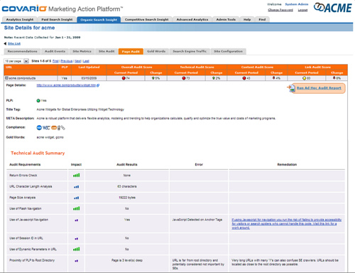 One enterprise-level SEO scoring technology that supports such a data-driven approach to SEO is Covario’s Organic Search Insight — which gets so granular that components of navigation, URLs and so forth are assessed (as can be seen in the screenshot below). Craig MacDonald, VP of Marketing and Product Management told me “The impact analysis can also be statistically modeled, based on gathering data across many sites over time in order to ascertain the relationship between changes in factors and the impact of those relative factors on the various search engines – i.e., the science can be rigorously applied.” From that, specific recommendations are automatically made and prioritized.